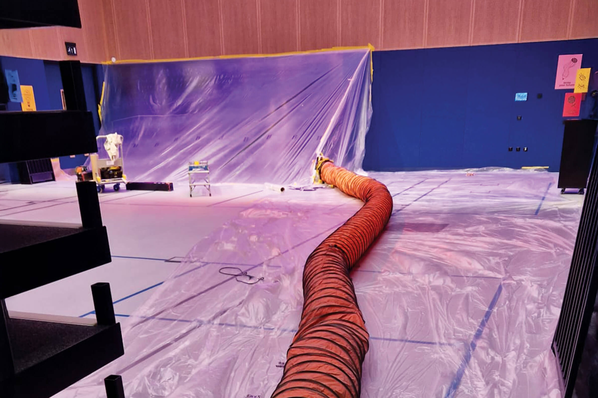 As the work was carried out in a live hotel environment, careful planning was required to manage fumes, overspray, and guest movement. The area was fully tented off and an extraction system installed to control airflow and ensure safe working conditions. The doors were then professionally prepared and resprayed to achieve a consistent, durable finish.